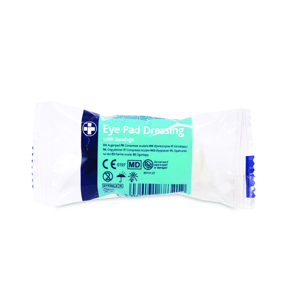 Thick, comfortable sterile eye pad dressings, attached to continuous stretch bandage. The dressing pad has a low adherent contact layer, designed not to stick.